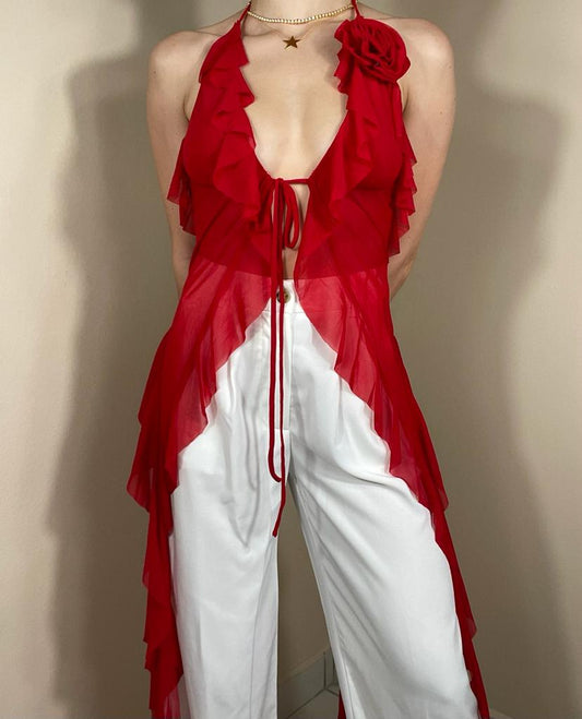 Maria Halter Neckline Rosette Detail Mesh Top