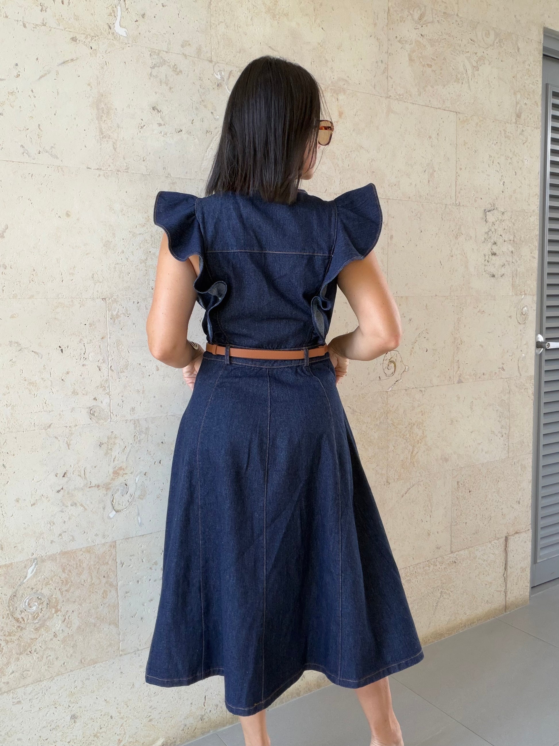 Effortlessly feminine with a touch of classic charm — this denim midi dress blends structure and softness in the most flattering way. Designed with delicate ruffle shoulder details and a full front button-down closure, it creates a timeless silhouette while adding subtle romantic flair. The structured denim fabric enhances the shape while remaining comfortable for all-day wear, making it a versatile staple for any season. 🤍