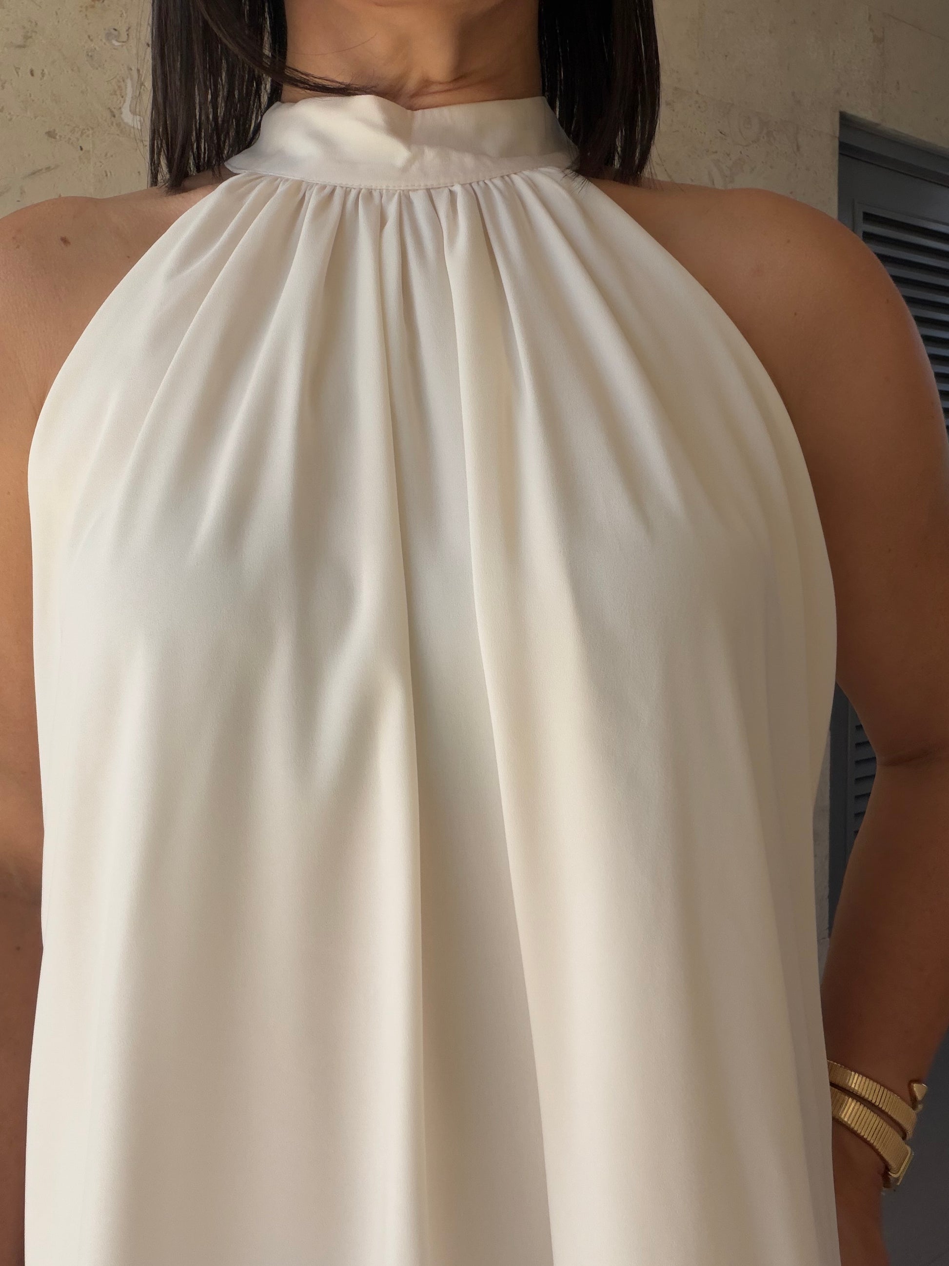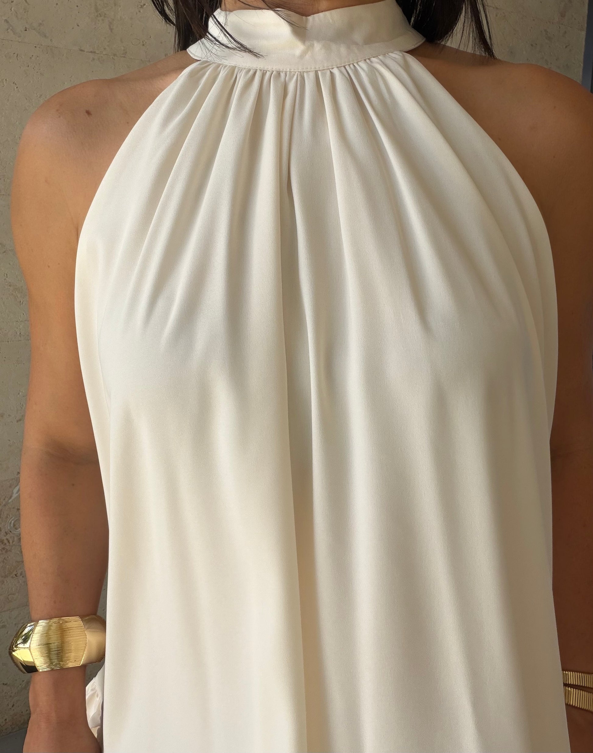 Halter neckline, sleeveless design, ribbon detail, mini length, soft stretch fabric for a comfortable and flattering silhouette.