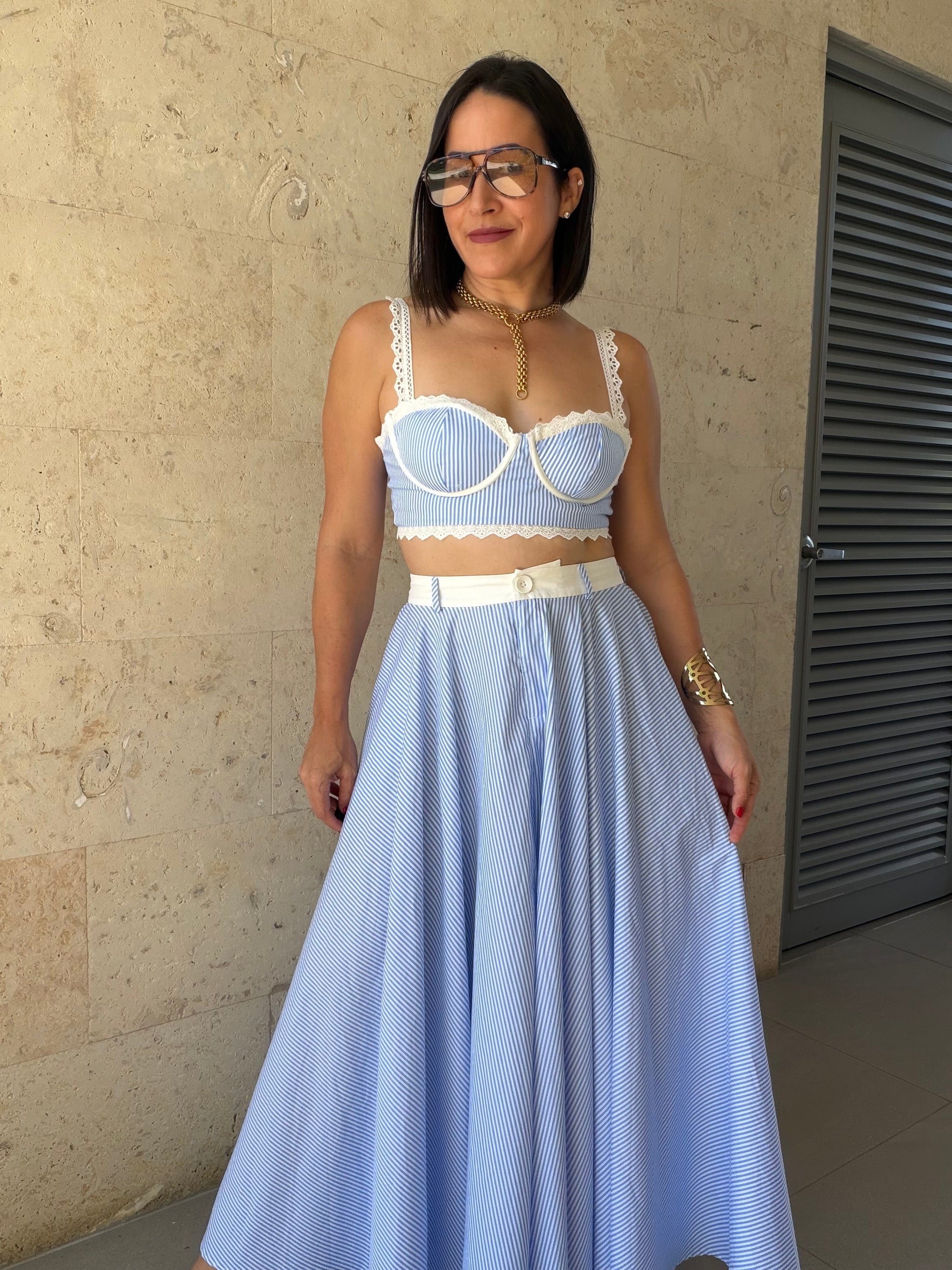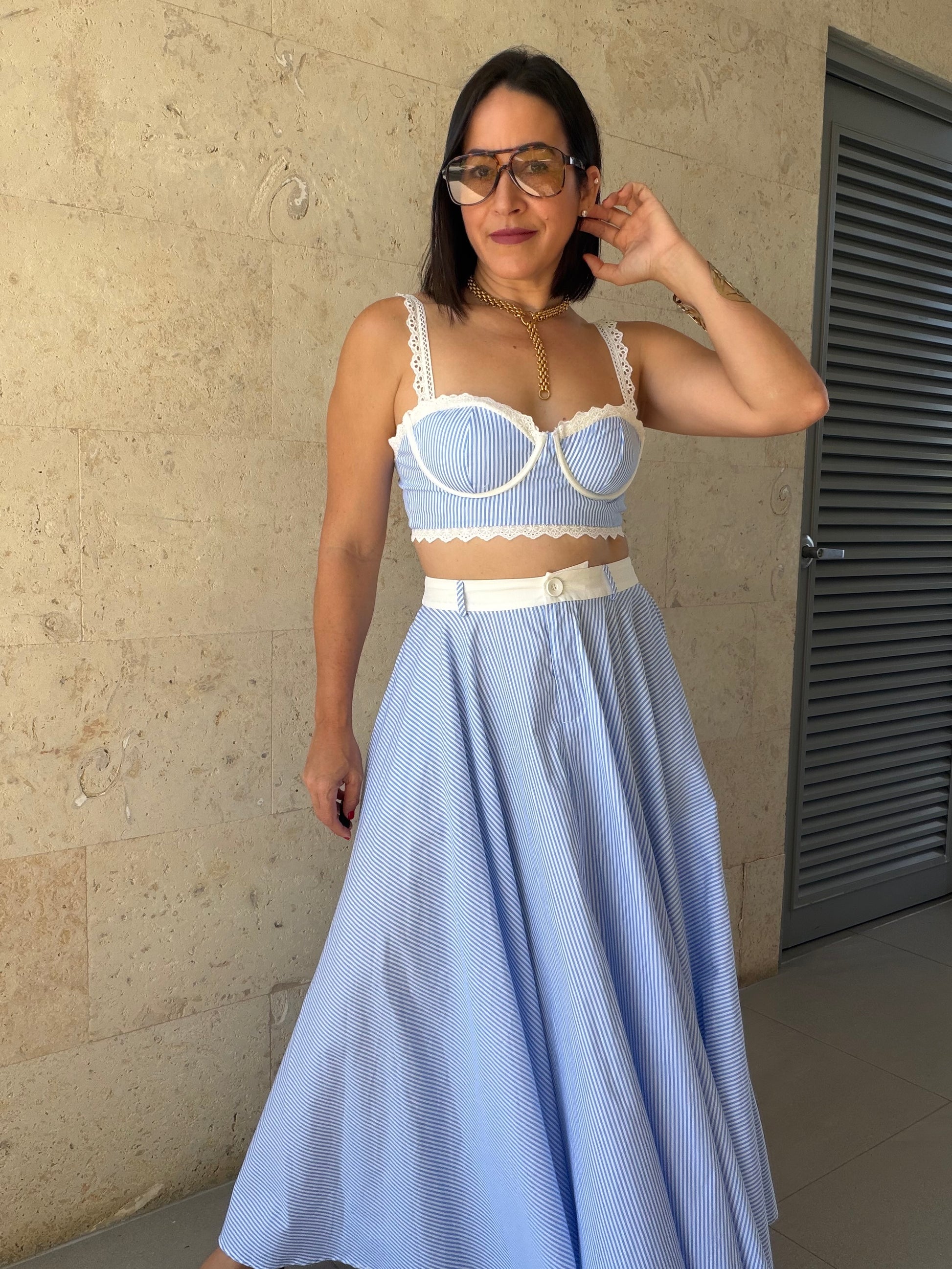 Fit: True to size — bralette with adjustable straps and underwire support, skirt flows with a relaxed, high-waisted silhouette